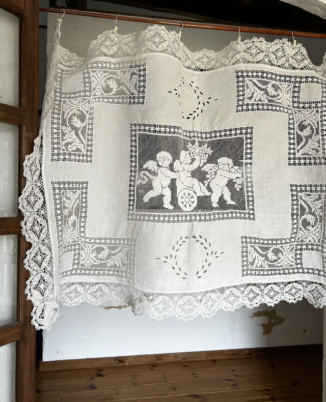 アンティークカーテン <小さな天使たち> アンティークレースの中でも人気の高い、天使の模様が描かれたテーブルクロスです 天使の図柄は幸福や愛を象徴するモチーフとして、19世紀当時のヨーロッパのレースに多く用いられていました 中央には可愛らしい天使のモチーフが描かれ、その周りを囲むように幾何学の植物柄のフィレレースが施されています 小さな葉模様のカットワーク刺繍とやさしく絵柄を包み込むクロッシェレース 美しい技法が重なり合った一枚です ◇サイズ:横約117cm×縦約87cm (縁取りに手編みの部分がありますので採寸に誤差が生じます) ◇色:生成り(薄いベージュ) ◇素材:リネン ◇国:フランス ◇時代:アンテイーク時代のもの リネン生地は張りのあるしっかりとした糸で織られおり、この時代のリネンらしい風合いが感じられますが、洗いを重ねるごとに少しずつ馴染んでいきます 布地の下の方に糸の解れとシミが数カ所見られます(写真9、10枚目) アンティークのお品物へのご理解をいただけますと幸いです ▷お手入れ/取り扱い注意事項 ・手洗いを推奨します。 ・漂白剤は使用しないでください。 ・直射日光の当たる場所での保管は避けてください。 ▷発送・注文に関する情報や注意事項 ・ご注文から発送まで3-5営業日いただきます。 ご質問やご不明点については、ショップのお問い合わせからお気軽にご連絡ください。