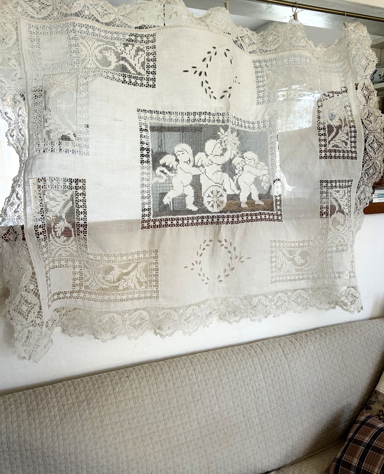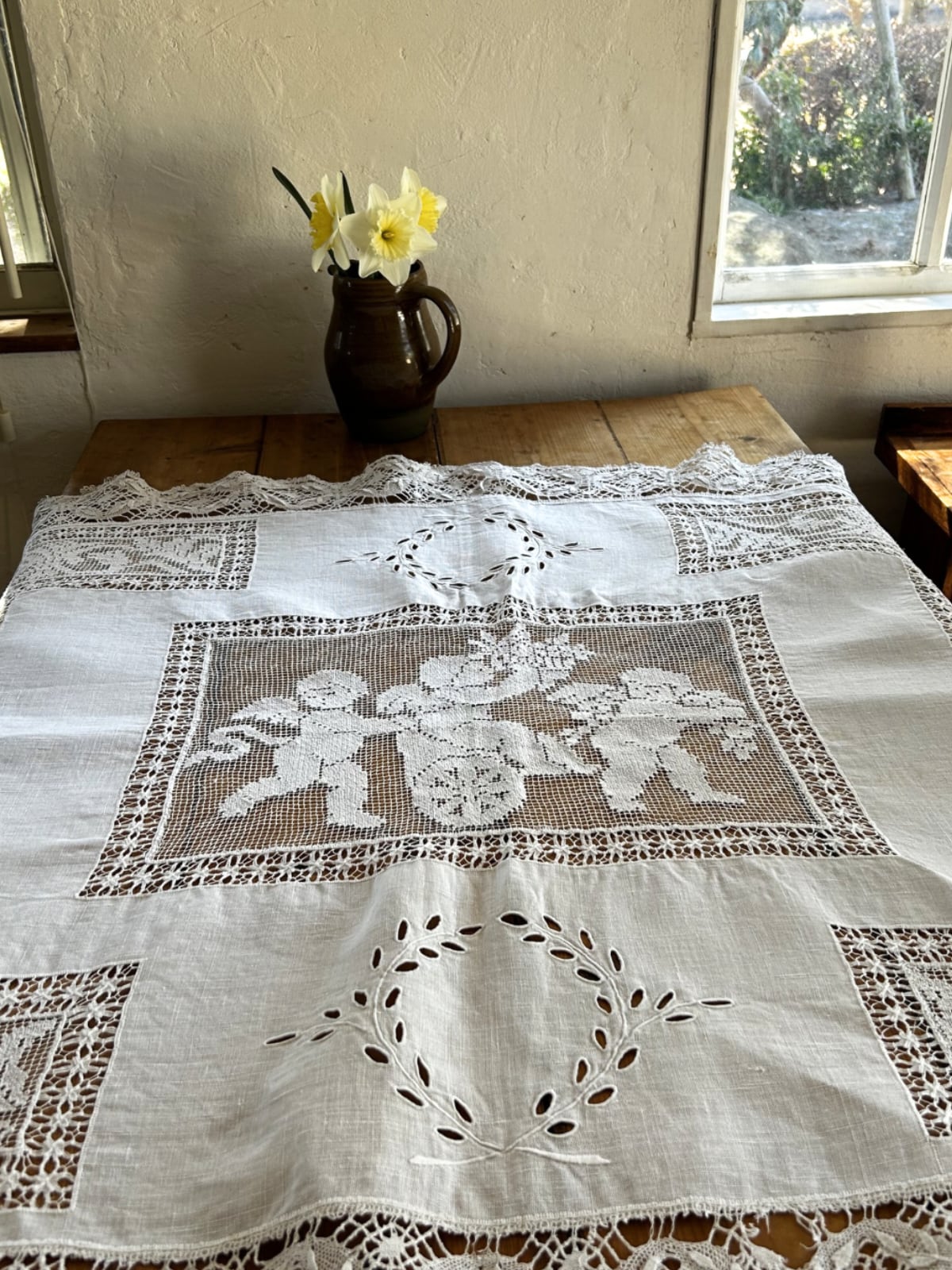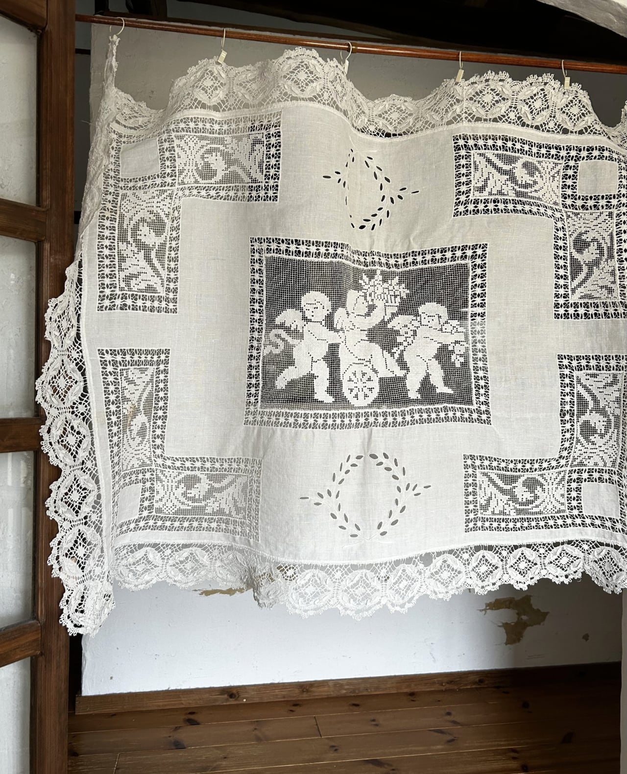 アンティークレースの中でも人気の高い、天使の模様が描かれたテーブルクロスです
